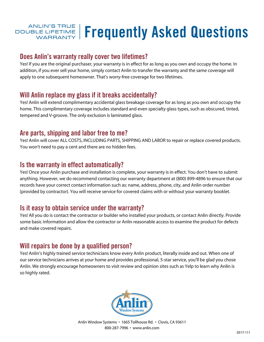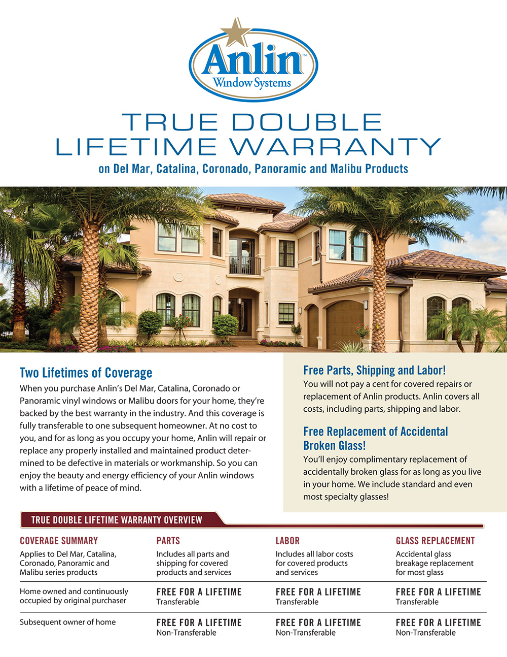 Our lifetime warranty is fully transferable to the next homeowner. It covers glass breakage for any reason — not just manufacturer defects. And we put it all in writing, so you have real protection, not just verbal promises.
